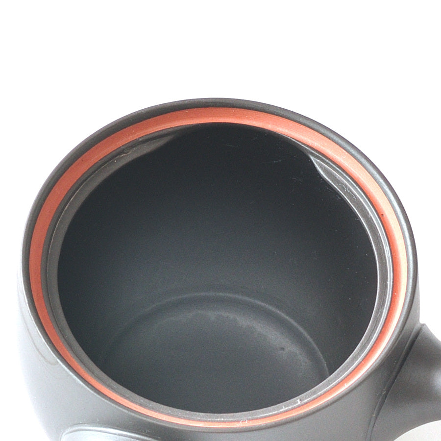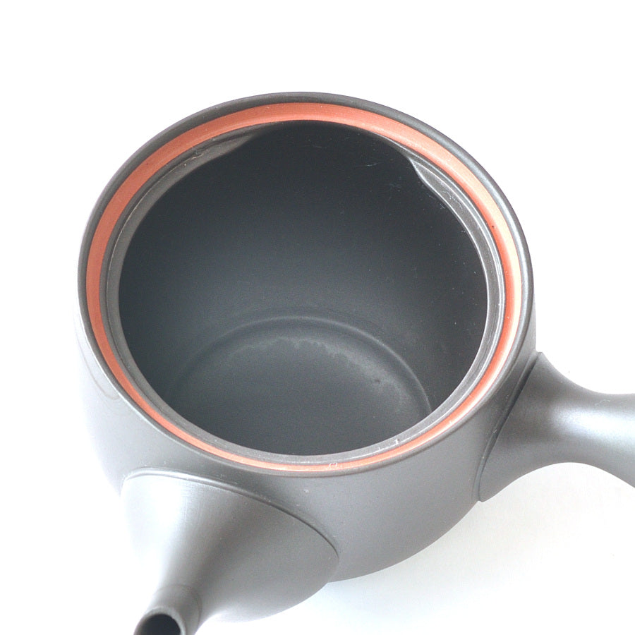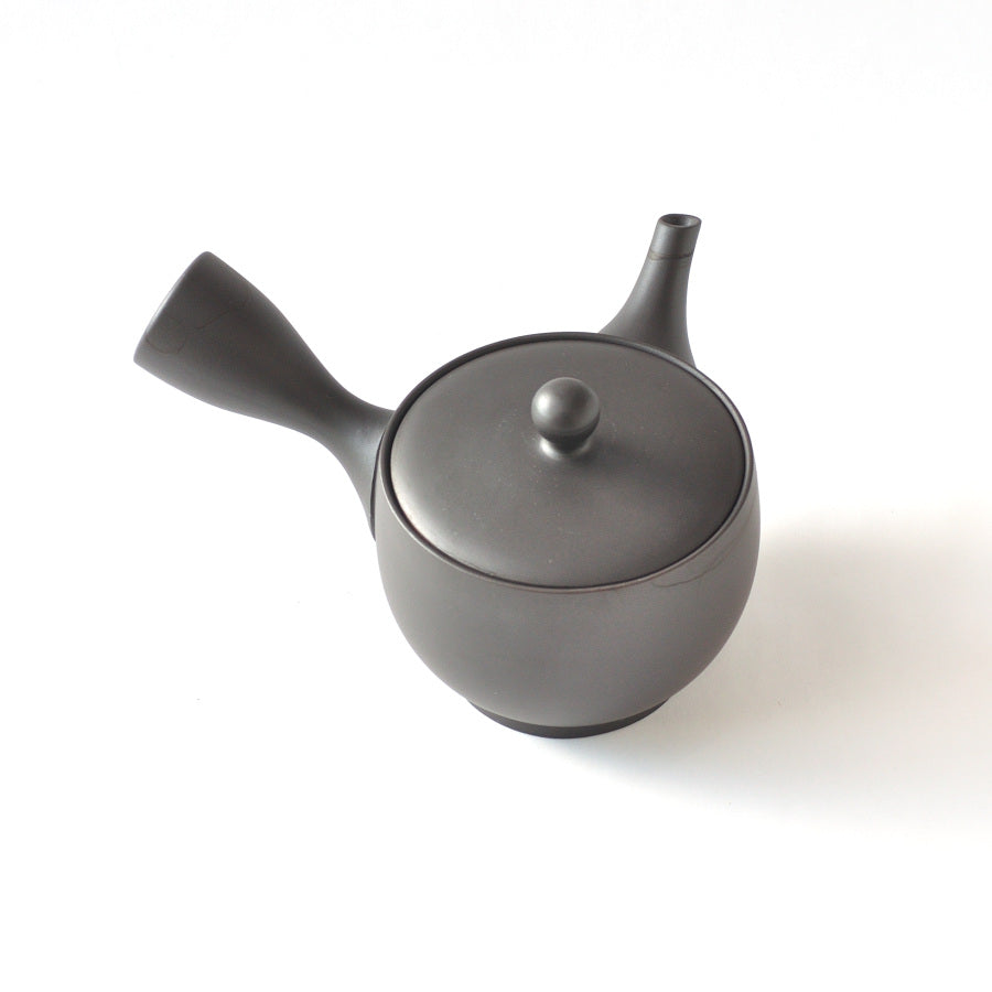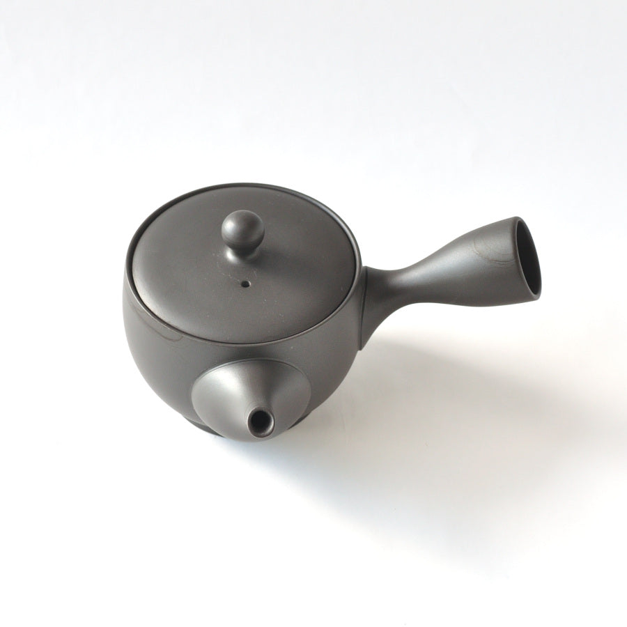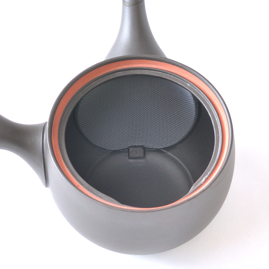 黒一色のシンプルで飽きの来ないデザインです。また、使い勝手にもこだわり、湯切れの良い注ぎ口、鉄味が出ず茶殻がこびりつきにくいフッ素網、急須の縁をカットして茶殻を捨てやすくしています。
